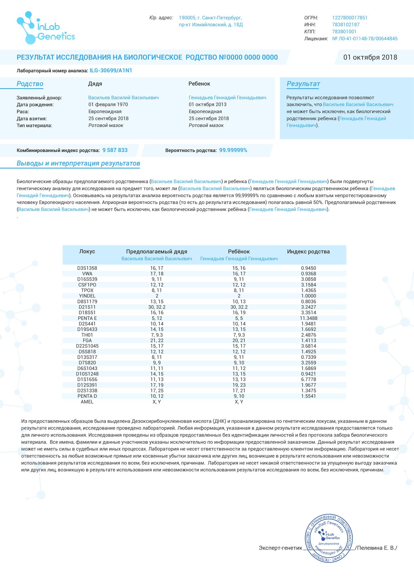 Существуют разные ситуации, когда требуется установить родство между дядей (тетей) и племянником (племянницей) в Орлове. Анализ может проводиться анонимно (без подтверждения личностей), а также для судебных целей с полной идентификацией всех участников процесса.