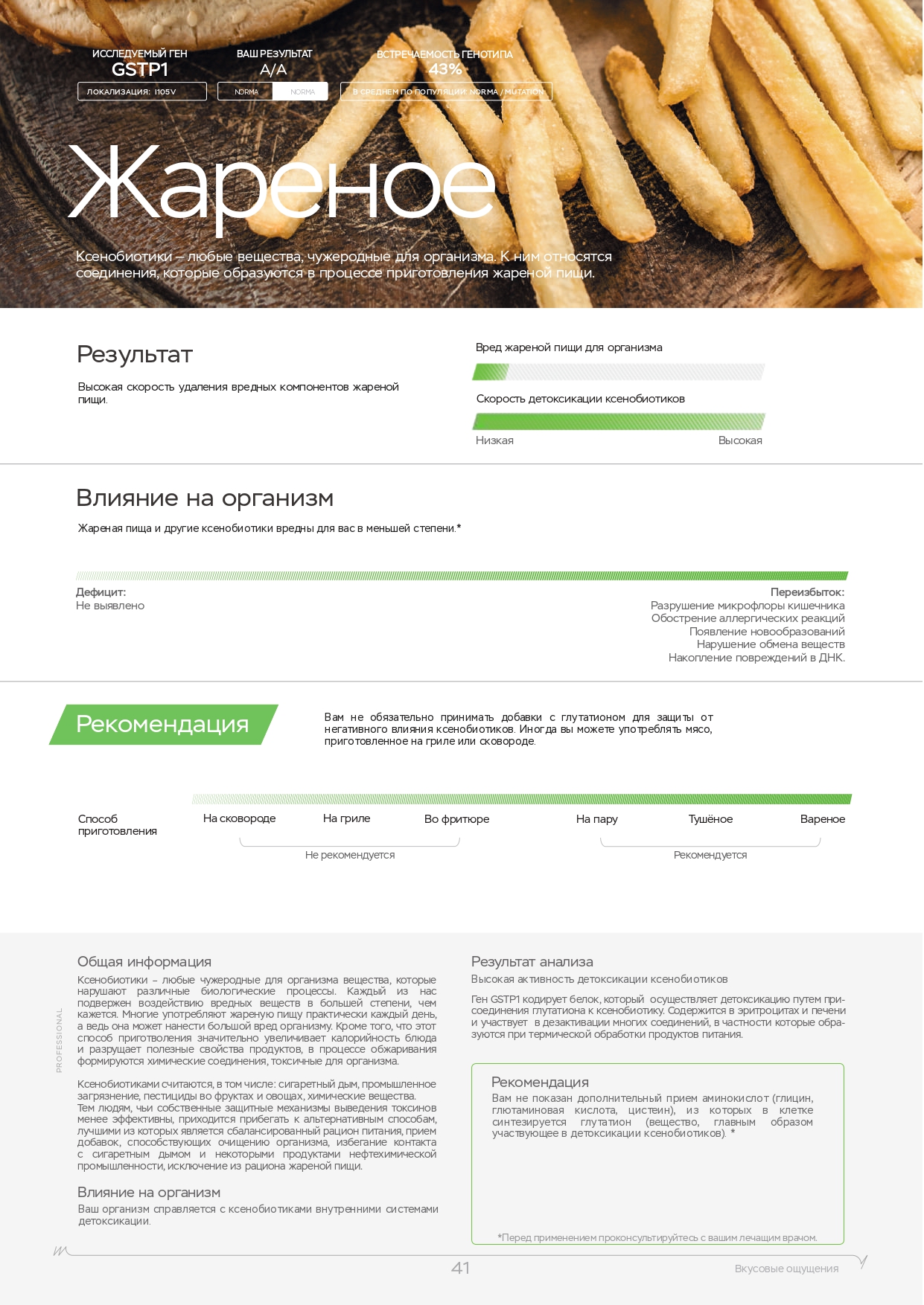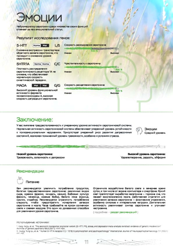 Этот ДНК анализ показывает влияние наиболее важных 10 генов на психическое и эмоциональное состояние. Именно они регулируют выработку гормонов, работу нейромедиаторов. Используйте знания о природных свойствах своего организма для борьбы со стрессом, повышения работоспособности и общего тонуса. Каждый человек индивидуален, поэтому мы рекомендуем пройти наш генетический нейро тест в Орлове.